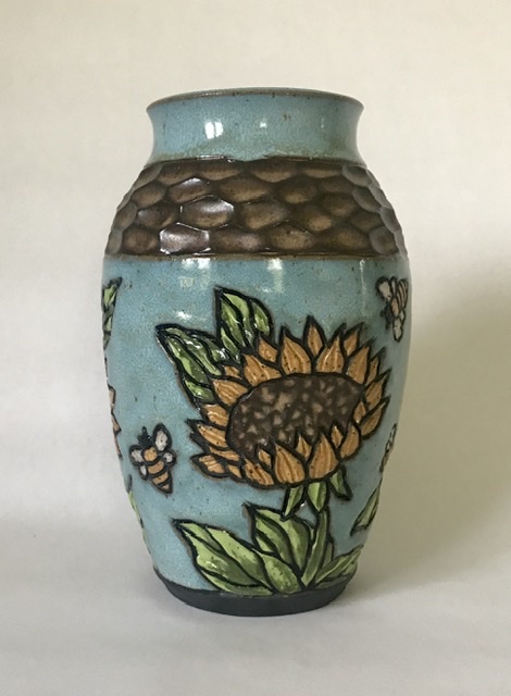 Shiny blue vase with narrative scene of sunflowers and honeybees in front of a rich glassy reduction-looking blue background. The chiseled cocoa texture on the upper third is one of the recognizable trademarks of JCR Designs pottery.