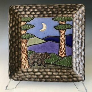 The Five Bee Square Plate is one of my new variations on the popular honeybee theme for 2021. Two eye-catching outer borders leading up to the main subject: Five busy bees hovering above a hand-carved field of honeycomb. Glaze. This platter has a flat bottom and has a surprise honeybee above my shop mark on the backside.