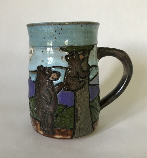 A momma bear helping her little cub climb a tree . The backside of the mug and handle are chiseled with matte cocoa glaze, and the interior and upper rim is a soft, shiny turquoise blue.